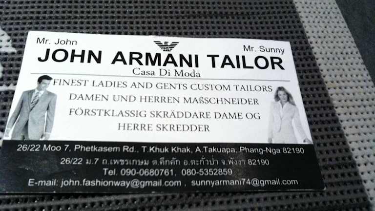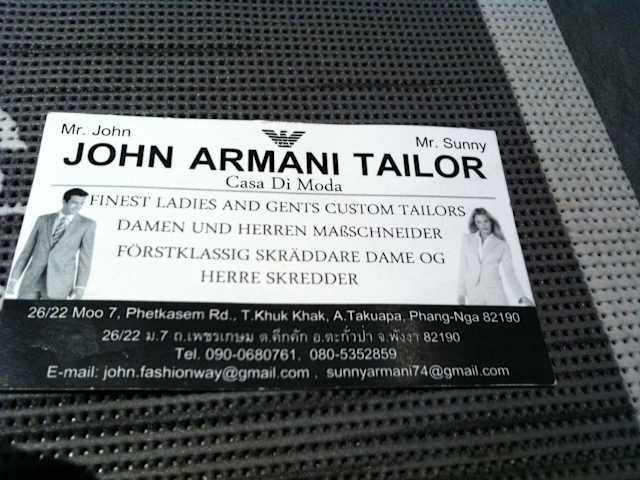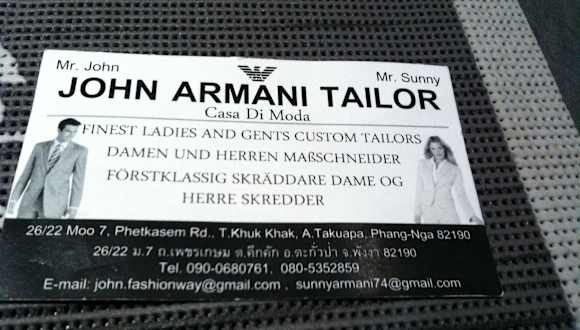 Im April 2015 war ich in Khao Lak im Urlaub und wollte mir ein Kleid nähen lassen. Ich war bei John Armani Tailor gleich neben dem Indischen Restaurant .Es wurde Maß genommen und 2000 Baht etwa 60€ angezahlt.Nach mehreren Anproben war das Kleid total versaut. Daraufhin wurde ein neues Kleid angefertigt das wiederum auch nicht passte.Da ich meinen Urlaub nicht beim Schneider verbringen wollte haben wir abgebrochen und wollten die Anzahlung zurück.Der Inhaber weigerte sich die Anzahlung zurück zu geben.Kurz gesagt : keine Weiterempfehlung!!! Kein Kleid kein Geld zurück.