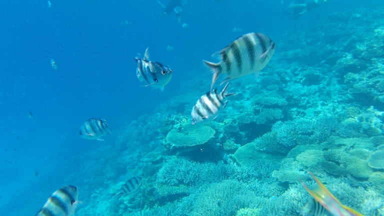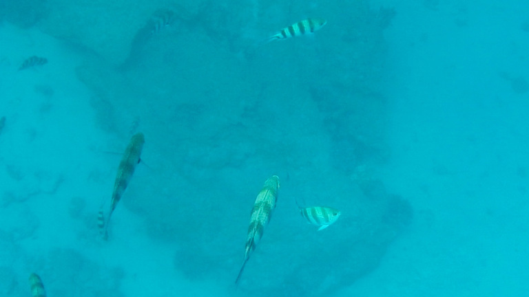 Leider sind nur vereinzelt kleine Fische bei Ebbe zu beobachten. Das Hotel besitzt kein Riff. Wer mehr Fische sehen will empfehle ich die Schnorcheltour mit dem Sky Aqua Center. Wunderschöne Fische - das sollte man sich nicht entgehen lassen!
