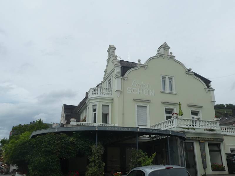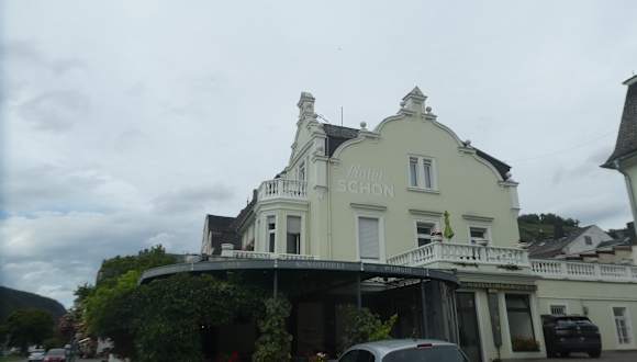 Nach unserer Wanderung von Rüdesheim durch die Weinberge über Niederwalddenkmal und vorbei an der Ruine Ehrenfells nach Assmannshausen haben wir im Café Schön (im Hotel Schön) in der Rheinuferstraße 4 eine Pause eingelegt und dabei etwas getrunken und gegessen. Wir saßen hier schön auf der Terrasse mit Blick zur Rheinpromenade und zum Rhein. Es war eine sehr angenehme Pause.