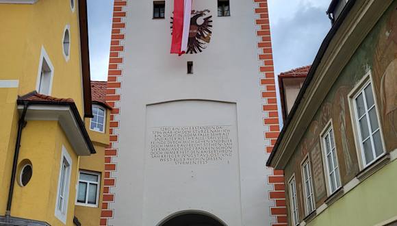 Der Schwammerlturm (früher Mautturm) ist heute das einzige erhaltene Stadttor von Leoben und außerdem das Wahrzeichen dieser Stadt. Er wurde mehrfach renoviert und anschließend mit dem pilzförmigen Dach versehen, daher der Name "Schwammerlturm". Leider haben wir zu spät erfahren, daß dieser Turm auf Anfrage im Tourismusbüro zu begehen ist. Von oben hat man sicher auch eine schöne Aussicht auf die Stadt Leoben.