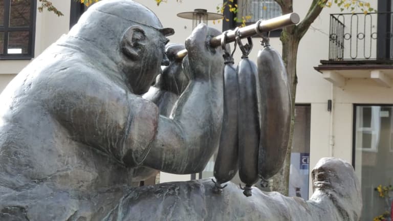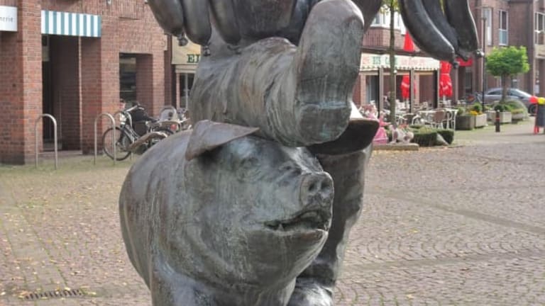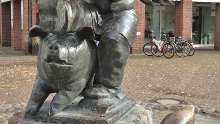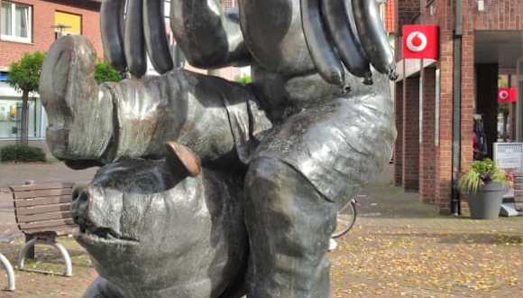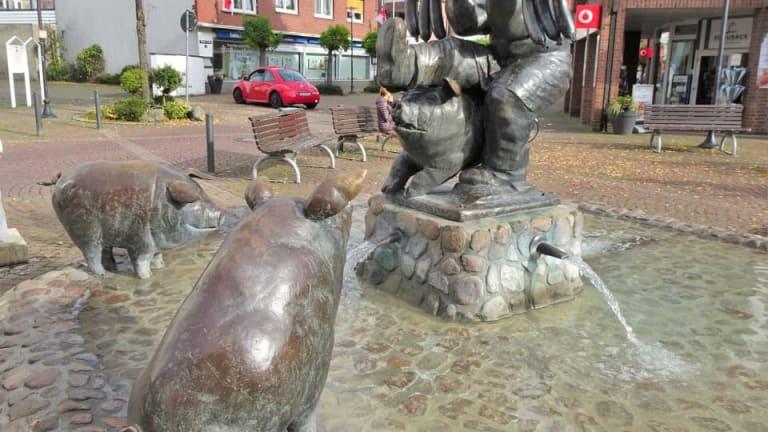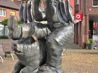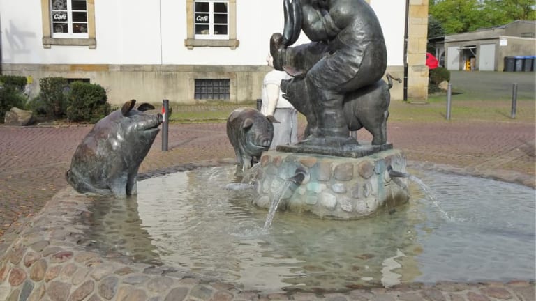 Versmold gilt zurecht mit mehreren Betrieben der Fleischwarenindustrie als „Wurstküche Westfalens“ und auch wenn die Produktion inzwischen aus der Altstadt in die Peripherie verlagert wurde, erinnert direkt am Marktplatz ein Brunnendenkmal an den bis heute wichtigsten Wirtschaftszweig der Stadt: Der „Wurstträgerbrunnen“. Im Mittelpunkt des von Professor Robert Günzel geschaffenen Ensemble steht der Wurstträger, der auf einer Stange sechs pralle Würste befördert und dabei von einem frechen Schwein beinahe zu Fall gebracht wird, während zwei weitere Schweine am Brunnenrand die Szene beobachten. Nach mehr als 30 Jahren hat sich die lustige Bronzegruppe, die überall nur „Schweinebrunnen“ genannt wird, zum heimlichen Wahrzeichen der Stadt entwickelt und lohnt einen kurzen Abstecher bei der Besichtigung der Versmolder Altstadt.