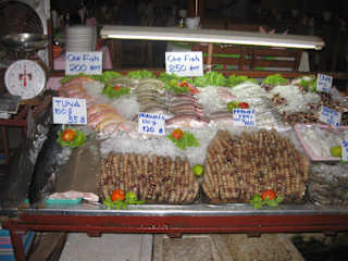 Am Südende des Karon Strandes, in Nähe des Andaman Seaview Hotels und des Cricket Stadions befinden sich sechs Hütten in denen sich die Seafood Restaurants befinden. Während des Essens kann man den Sonenuntergang erleben und geniessen. Es wird neben Fisch auch sehr gutes und preiswertes Thaifood angeboten. Auch bekommt man europäisches, aber teurer. Wir haben dort mehrmals gegessen und sind in der Regel mit weniger als 600 Baht für 2 Personen inklusive Gertränke ausgekommen.