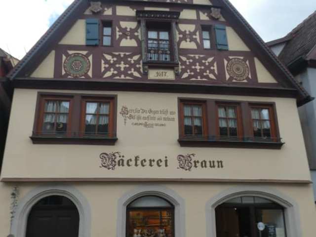 In der Rödergasse 10 in Rothenburg ob der Tauber befindet sich die Bäckerei Braun. Es ist eine kleine, preisgünstige Bäckerei mit Café. Gegenüber der Rödergasse stehen auch diverse Sitzmöglichkeiten im Freien zur Verfügung (von hier hat man einen guten Blick zum Rödertor / Röderturm, auf dem ein Storchennest ist). Wir legten hier im Freien eine Pause ein, bei Kaffee und einer Kleinigkeit zum Essen, genossen wir den Ausblick.
