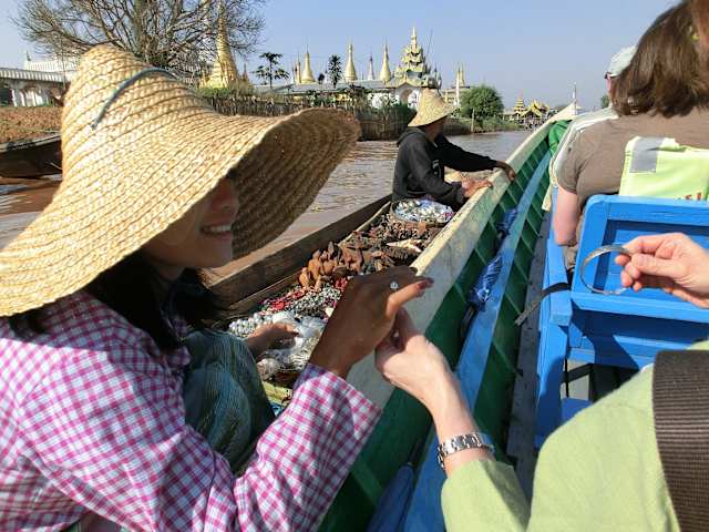 Auf dem Inle See gibt es viele Handwerksbetriebe. Unter anderen haben wir mit dem Boot auch eine Silberschmiede angefahren. Hier werden feinste Silberarbeiten hergestellt. Nicht nur Schmuck, sondern auch schöne Dekoartikel. Im angrenzenden Verkaufsraum fällt die Auswahl schwer. Die Preise sind nicht billig. Wie immer ist handeln angesagt. So sollte man, wie unsere Reiseleiterin meinte, etwa 20 % weniger zahlen als der genannte Preis. Dann hat man für alle einen fairen Preis. Silberschmuck wird auch außerhalb bei "fliegenden Händlern" in ihren Booten angeboten. Allerdings kann man nicht unbedingt sicher sein, daß es auch Silber ist. Hier sollte man sich durch den Stempel absichern, wir haben auch ihnen Silberschmuck abgekauft.