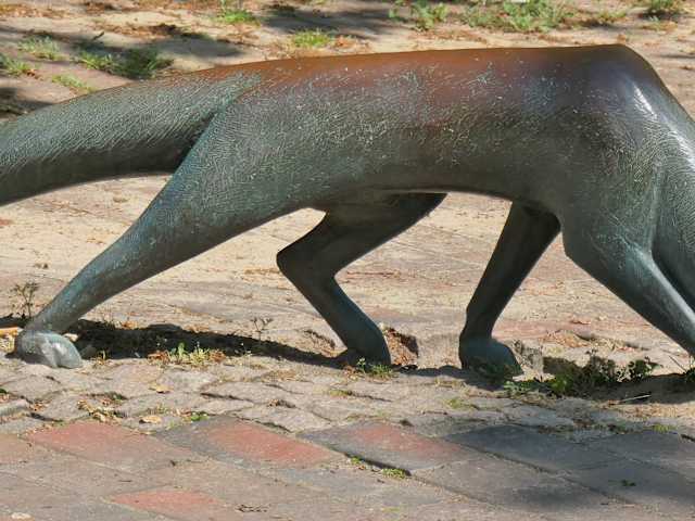 Die Nase auf dem Boden, schleicht der Fuchs schnüffelnd durch den Kurpark von Cuxhaven. Es ist eine durchaus nette Skulptur, die sich in der Nähe vom See im Kurpark befindet.