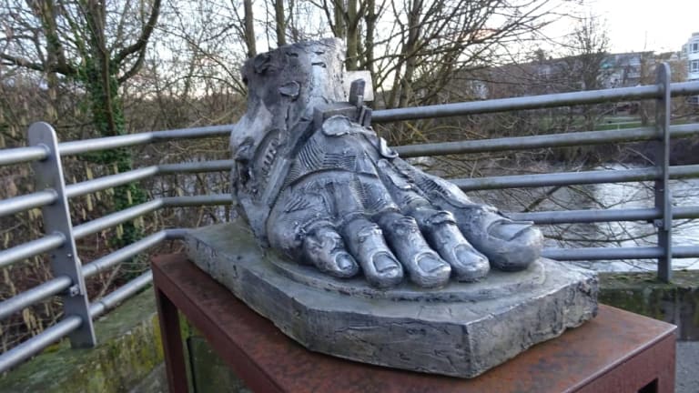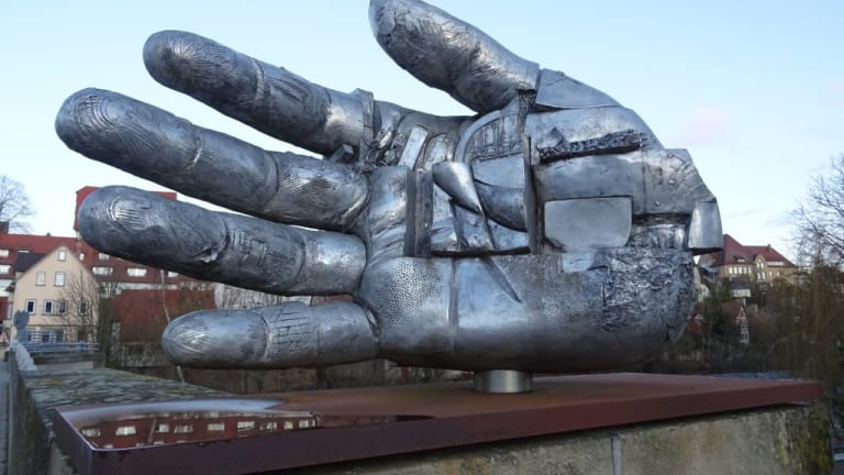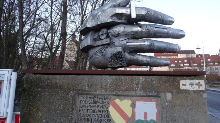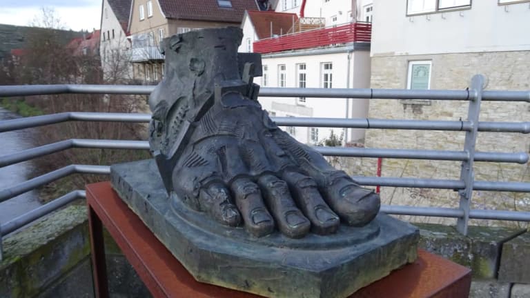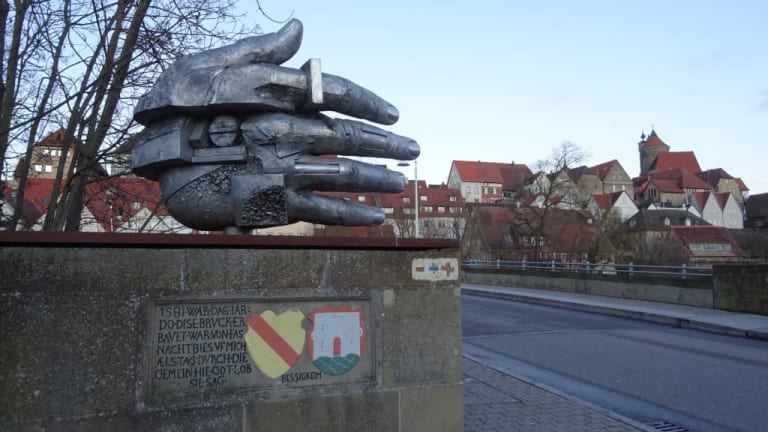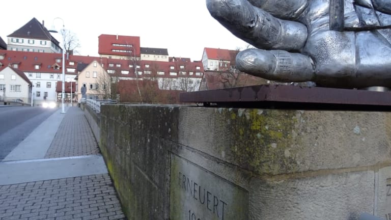 An der Enzbrücke weisen zwei große Skulpturen in Form von Händen den Weg in die Altstadt von Besigheim. Auf der Brücke selbst ergänzen zwei überdimensionierte Füße das Kunstwerk, welches auf die Gefährdung des Menschen durch Krieg, Machtmissbrauch und Terror hinweisen soll.