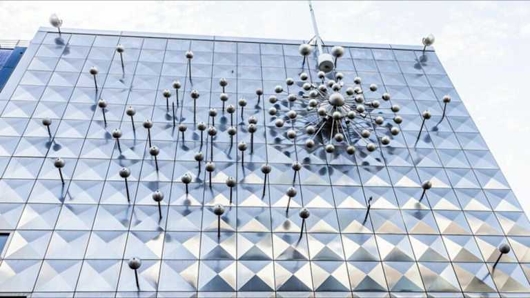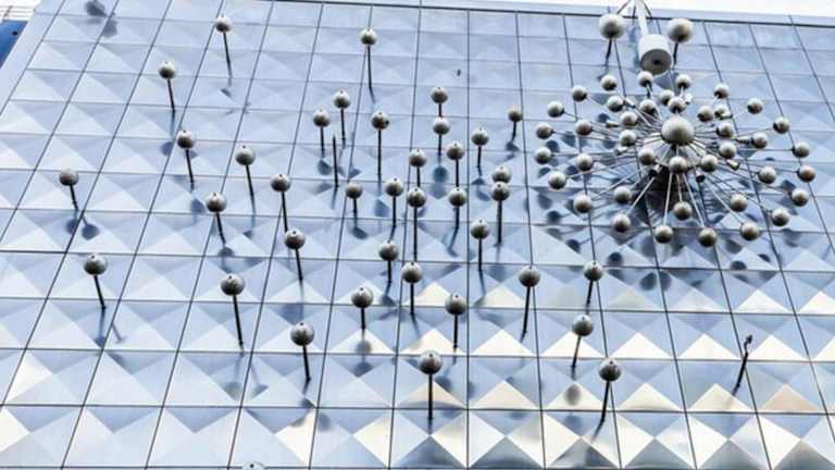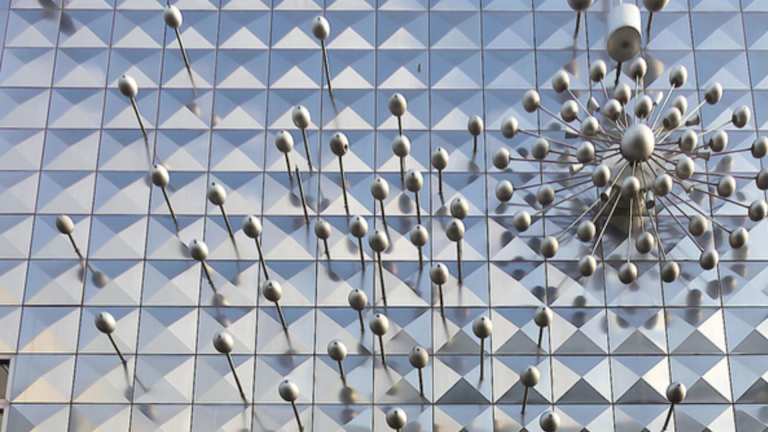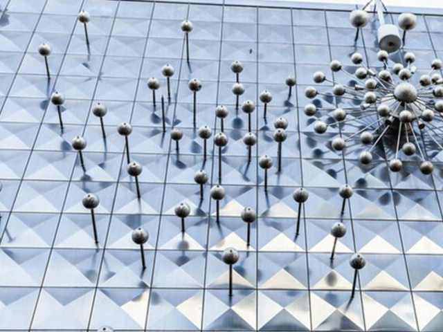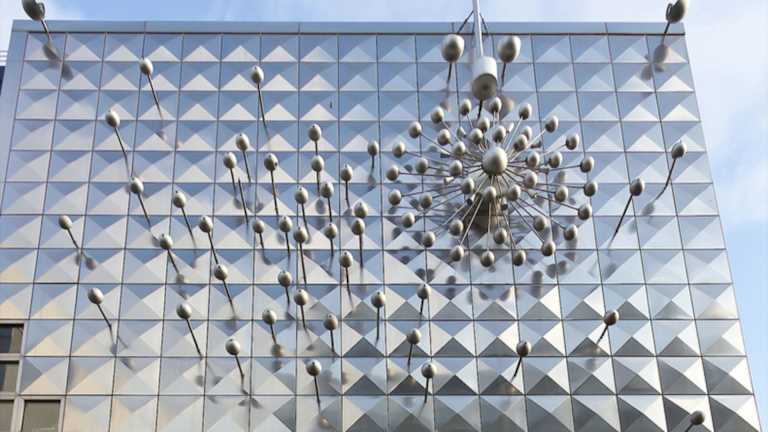Um die Installation „Licht und Bewegung“ sehen zu können, die sich in Köln in der Hohe Straße 124-126 befindet, muss man den Kopf hochheben und nach oben schauen, denn es befindet sich hoch oben an der Fassade des hier befindlichen Geschäftshauses, dem ehemaligen Wormland-Haus. Diese Installation stammt aus dem Jahr 1966 und ist ein Werk von Otto Piene (geboren 1928, gestorben 2014). Das Kunstwerk entstand im Auftrag des Modeunternehmers und Kunstsammlers Theo Wormland, der es für die Kölner Filiale seiner Modekette Wormland anfertigen ließ. Otto Piene, der als Wegbereiter der Lichtkunst gilt, ließ die Straßenfassade des Modegeschäftes mit einzelnen Platten aus Edelstahl verkleiden und mit diversen, teils beweglichen, Kugeln versehen. Ursprünglich waren diese Kugeln für 59 Sekunden in rotierender Bewegung, danach war sieben Minuten Pause, gefolgt von 59 Sekunden rotierender Bewegung, danach wieder sieben Minuten Pause, gefolgt von 59 Sekunden rotierender Bewegung, danach wieder sieben Minuten Pause usw. Jetzt steht diese Installation seit vielen Jahren still, denn angeblich ist ein für die Bewegung zuständiges Steuerungselement defekt und sollte repariert / ausgetauscht werden. Inzwischen wurde das Wormland-Haus verkauft (und damit ging aus das Kunstwerk „Licht und Bewegung“ an die neuen Eigentümer über), die Reparatur wurde eingestellt und das Kunstwerk steht seitdem still. Ob es jemals wieder in Betrieb geht ist fraglich. Obwohl also die Installation „Licht und Bewegung“, die als eines der wichtigsten modernen Kunstwerke in der Kölner Innenstadt gilt, nicht mehr in Bewegung ist, ist es noch immer eine beeindruckender Sehenswürdigkeit und ein besonderer Blickfang.