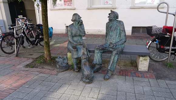 Die schöne Bronzeskulptur von Friedrich Büschelberger stellt ein Paar, welches sich unterhält, dar. Vor der Bank sitzt ein Hund und schaut zum Paar hoch. Schönes Fotomotiv.