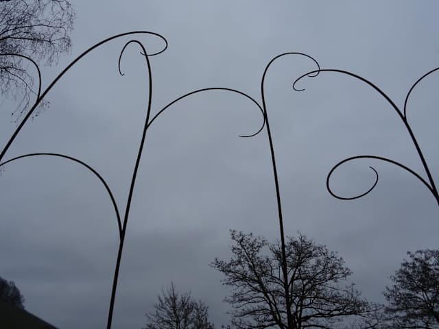 Direkt am Parkplatz der Burg Hohenbeilstein befindet sich die Skulptur mit einer Infotafel "Landschaft - Kulturgut - Genuss" bzw. Winzern und Weingütern. Mehrere meterhohe Rebenranken aus Metall strecken sich dem Himmel entgegen.