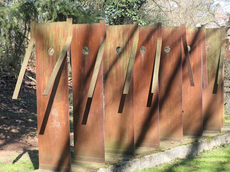 Im Motherwellpark, auf dem Weg vom Kornmarkt runter zur Straße Am Oberen Marienbach, kommt man an der Installation „Reise ohne Wiederkehr (2002)“ vorbei. Wie es heißt, entstand dieses Werk der Künstlerin Juliane Lenzer „unter dem Eindruck des Kosovo-Krieges“. Sieben Stahlplatten, die stilisierte Soldaten bzw. menschliche Silhouetten darstellen, marschieren in Reih und Glied. Hinter dem letzten Soldaten ist eine Visier-Vorrichtung, durch die man hindurch und weiter durch die Soldaten hindurch schauen kann, da in Soldaten auf Höhe der Visier-Vorrichtung jeweils ein rundes Loch ist.
