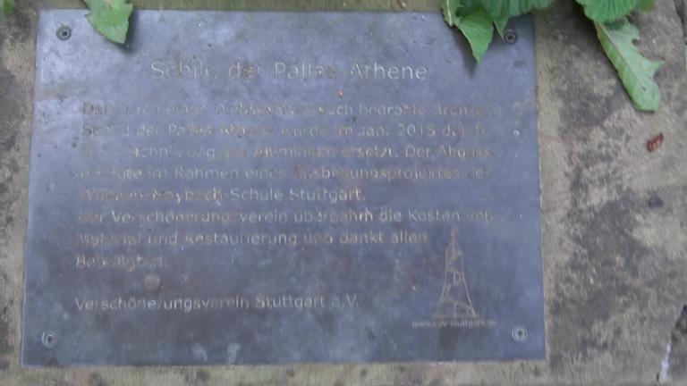 Am Ende des Jean-Améry-Wegs thront eine Statue oberhalb einer Brunnenanlage. Es ist Pallas-Athene. Sie hält einen Bronzeschild in ihrer linken Hand, auf dem Schild ist eine Eule zu sehen. Athene gilt, neben ihrer Rolle als Namensgeberin und Schutzgöttin Athens, als Göttin der Weisheit und als Schirmherrin der Künste und Wissenschaften. Adresse: Humboldtstraße 44, 70178 Stuttgart Webseite: http://www.vsv-stuttgart.de/ Geodaten: Q598+54 Stuttgart