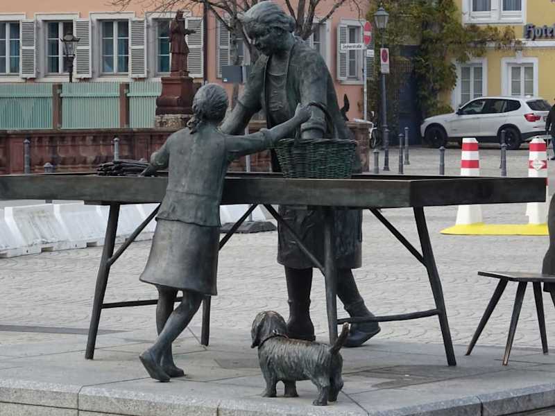 Direkt vor der Brauerei zum Ritter steht eine Bronze als Andenken zur badischen Spargelfrau. Es zeigt einen Verkaufsstand mit Spargen und die Verkäuferin. Gross. Mehrere Spargen aufgestappelt, wirkt so echt, als würde man morgen früh dort Spargel kaufen gehen.