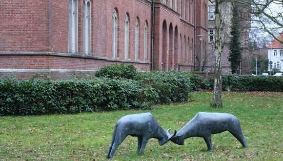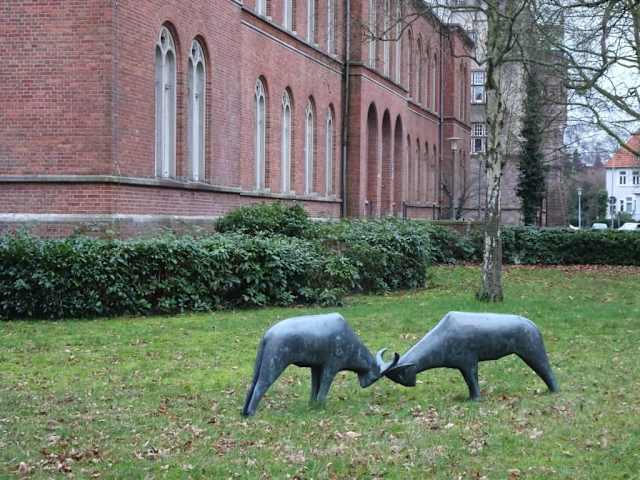 Auf einer Rasenfläche vor dem Landgericht Oldenburg stehen sie sich seit 1971 unversöhnlich mit gesenktem Kopf und ihren verhakten Hörnern gegenüber: Die bronzenen „Streithammel“ des Künstlers Peter Lehmann. Im Jahr 1965 wurde die Skulptur zunächst vor dem Gericht in Elsfleth enthüllt und als man dieses später aufgelöste, zogen die Tiere nach Oldenburg um. Kräftemessen der Streitparteien statt „Austausch von Argumenten“ steht hinter dem Kunstwerk, mit dem der Künstler humorvoll die Situation der beiden Dickschädel in Kontext zum Gerichtsalltag setzt. Statt einen Sockel zu verwenden, stehen die beiden Hammel direkt auf dem Rasen und wenn man das Werk etwas länger betrachtet, stellt man eine verblüffende Ähnlichkeit der Kontrahenten fest – Lehmann verwendete ganz bewusst die identische Gussform für beide Tiere. Beim Rundgang durch die Innenstadt von Oldenburg lohnt sich ein Besuch der „Streithammel“, die der Wasserzug der Mühlenhunte vom Schlosspark trennt. Peter Lehmann, zu dessen bekanntesten Werken sicherlich der „Schweinehirt und seine Herde“ in der Bremer Sögestraße zählt, starb 1995 in Großenkneten.