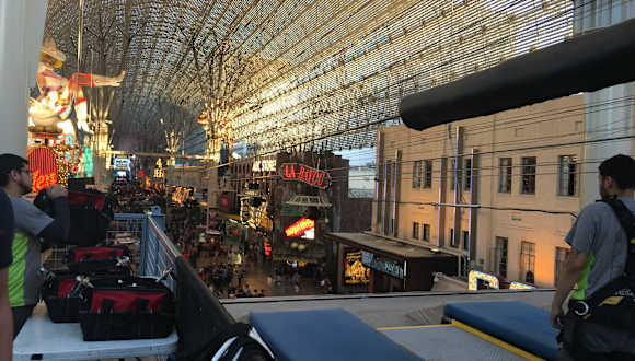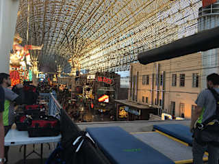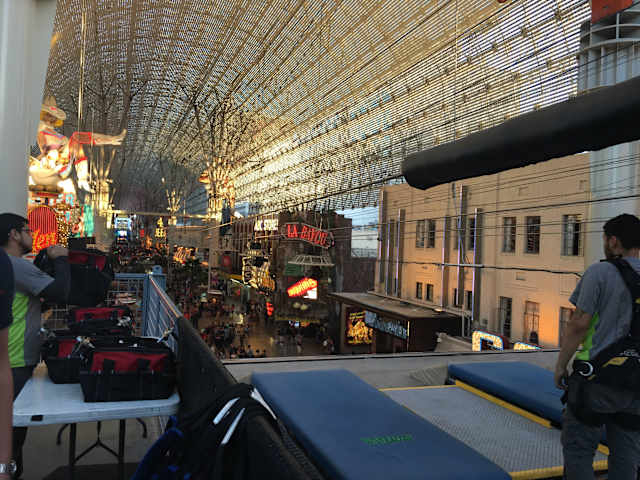 In der Fremont Stret in Las Vegas hat man sich etwas neues einfallen lassen, eine Zip LIne, über der Fremont Street. Es gibt 2 Strecken, 20 und 40 US Dollar teuer, für 20 Dollar überfliegt man sitzend die Hälfte der Fremont Street, für 40 Dollar überfliegt man liegend die gesamte Fremont Street. Im Buchungsbüro muß man am Automaten eine Zeit wählen ( Slot ) bezahlen und pünktlich am Aufzug nach oben stehen. Es ist schon ein geiles Gefühl über den Köpfen des Party Volks durch die Straße zu fliegen.