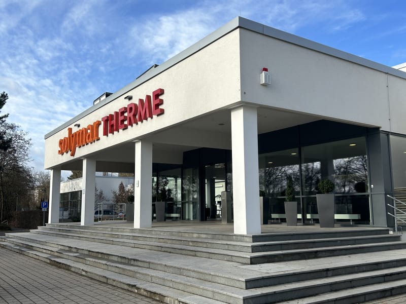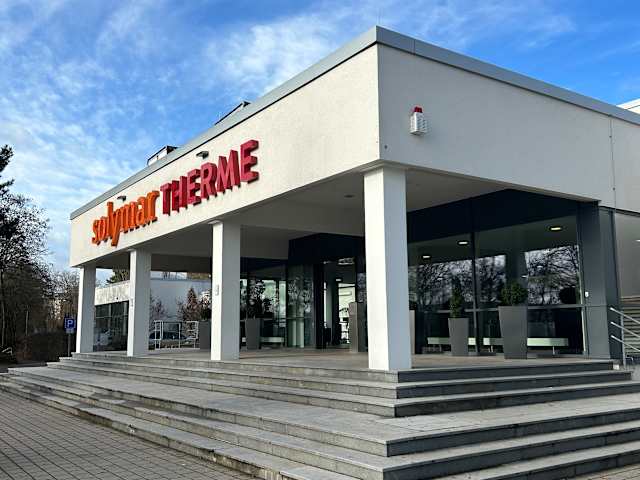 Das Vital- und Solebad ist der perfekte Ort, um die Seele baumeln zu lassen. Das Thermalbad der Solymar Therme besteht aus fünf verschiedenen, mit Heilwasser gefüllten Becken. Sie genießen je nach Becken in 34 Grad warmes bis 37 Grad heißes, besonders wertvolles Sole-Mineral-Thermalwasser. Wer hier eintaucht, lässt sich von sanften Wasserstrahlen massieren, empfindet den eigenen Körper als fast schwerelos und gönnt Körper und Seele ein Auszeit. Sie erwartet ein Mineralinnenbecken, ein Lithiumbad, ein Magnesiumbad, ein Meditationsbecken, ein Calciumbad und eine Textildampfbad. Die Solymar Therme macht in seinem Sport- und Freizeitbad nicht nur Sportschwimmern ein Angebot, sondern bietet der ganzen Familie mit seinen Wasserattraktionen Freizeitspaß im Wasser: - Sportbad - Wasserspiele für die Kleinsten - zwei spektakuläre Rutschen Die Solymar Therme empfängt Sie in einer großzügigen Saunalandschaft mit sechs verschiedenen Saunen, darunter eine Holzhaussauna auf einer Anhöhe im Saunagarten, und einem klassischen Dampfbad. Nach den Saunagängen und dem Abkühlen unter den Erlebniskaltduschen oder in einem Tauchbecken entspannen Sie auf bequemen Liegen. Eine besondere Attraktion ist der Innen- und Außenpool mit Luftssprudelsitzen. Eine Saunabar mit einem à-la-Carte Restaurant, das erlesene, frisch zubereitete, regionale Genüsse und Cocktails anbietet, lädt nach dem Saunabad zum Verweilen ein. - Öffnungszeiten: Sport- und Familienbad: täglich & Feiertags 9 – 22 Uhr Mo & M 7 – 22 Uhr Vital- und Solebad: täglich 9 – 22 Uhr Fr & Sa 9 – 23 Uhr Sauna: täglich 9 – 22 Uhr Fr & Sa 9 – 23 Uhr Anschrift: Solymar Therme GmbH & Co. KG Erlenbachweg 3 97980 Bad Mergentheim Tel. 07931 / 481 30-0 www.solymar-therme.de info@solymar-therme.de