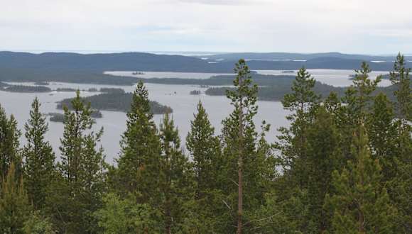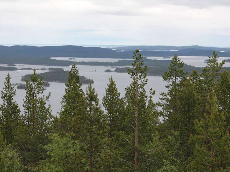 Einer der schönsten Aussichtspunkte zum Inarisee befindet sich auf den Sovintovaara Ivalo. Sovintovaara Ivalo liegt 10 km nördlich von Ukonjärven entfernt und ist der zweithöchste Berg der Region (320 m). Zum Parkplatz vom Sovintovaaran Huippu führt eine eng und steile Straße. Unser Busfahrer verbrachte hier eine Meisterleistung. Vor dem Parkplatz ist die Militärgeschichte Lapplands auf einer Hinweistafel dargestellt. Es ist u.a. eine Flugabwehrkanone und ein Teil der Junkers Flugzeug Heck zu sehen. Die Kampfhandlungen in Finnland zogen sich bis zum Frühling 1945 hin. Der letzte Ort Finnlands, der nach den am 25. April 1945 stattgefundenen Kämpfen mit den finnischen Truppen von den Deutschen geräumt wurde, war am 27. April 1945 das Dorf Kilpisjärvi im äußersten Nordwesten des Landes. Lappland hatte nie eine eigene Staatlichkeit und ist heute zwischen den vier Staaten Norwegen, Schweden, Finnland und Russland aufgeteilt. In einem erstarkenden Nationalbewusstsein der Ureinwohner ist die samische Flagge heute immer häufiger zu sehen. Auf dem Plateau des Berges befindet sich ein eingegrenzter Freizeitpark mit dem Namen Näköalapatka Viewpoint. Das Freizeitmuseum ist eine private Ausstellung. Der Freizeitpark ist nur in den Sommermonaten geöffnet und der Eintritt kostete 5,00 Euro. Wegen der hier an mehr als 200 Tagen oft weit unter dem Gefrierpunkt liegende Temperatur ist eine Zufahrt in den Wintermonaten hier nicht möglich. Im Freizeitpark sieht man u.a. alte Schlitten, Boote, Fässer und auch eine Feuerstelle und eine Unterkunft der einheimischen Ureinwohner. In einem Gehege befindet sich auch ein zahmer Wolf. Im 2.stöckigen Cafe mit Souvenirgeschäft konnte man eine Ausstellung und alte Photos besichtigen. Von der Cafeteria Terrasse hatte man einen traumhaften Blick auf den Inari See und die Hochmoore in Finnland und Russland. Der Inarisee mit seinen ca. 3000 Inseln ist der drittgrößte See Finnlands und der sechstgrößte Binnensee in Europa. Der Inarisee liegt nahe der Grenze zu Russland. Der Inarisee zählt mit seiner eigenwilligen Uferlandschaft und von der polaren Vegetation beherrschte Umgebung zu den touristisch interessanten Regionen Finnlands. Der Ausflug zum Sovintovarran Huippu mit seinem Freizeitpark Näköalapatka Viewpoint war einer der Höhepunkte unserer Reise durch Lappland.