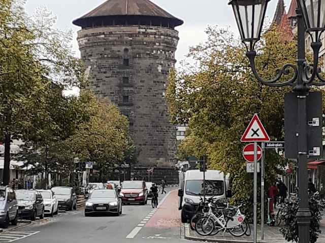 Das Spittlertor bzw. der Spittlertorturm von Nürnberg ist bereits seit 1377 als Teil der äußeren Stadtbefestigung Nürnbergs belegt. Diese äußere Stadtmauer wir auch als letzte Stadtmauer bezeichnet. Der Spittlertorturm ist einer von insgesamt vier markanten, runden Haupttürmen / Ecktürmen in der äußeren Stadtmauer. Die Anlage am Spittlertorturm umfasst auch den Spittlertorzwinger und die Rundbastei am Spittlertor. Richtung Norden schließt sich die Spittlertormauer und der Spittlertorgraben an, Richtung Osten folgt die Frauentormauer und der Frauentorgraben. Außerhalb der befestigten Altstadt, vor dem Spittlertor, befindet sich der Plärrer, ein großer Platz, der einer der wichtigsten Verkehrsknotenpunkte von Nürnberg ist. Richtung Altstadt sind es vom Spittlertor nur ca. 200 Meter bis zur St.-Jakobs-Kirche; von der Kirche sind es bis zum Weißen Turm und Hans-Sachs-Brunnen (Ehekarussel / Ehebrunnen) nochmals ca. 200 Meter. Der Name Spittlertor/-turm leitet sich vom Elisabethspital ab, das dem Deutschen Orden gehörte. Bei unserem diesmaligen Besuch Nürnbergs sind wir von der U-Bahn-Station Plärrer über das Spittlertor in die Altstadt von Nürnberg gekommen. Der Spittlertorturm und die ganze Anlage am Spittlertorturm (einschließlich Spittlertorzwinger, Bastei, Spittlertorgraben und der Stadtmauer) hat uns gut gefallen.
