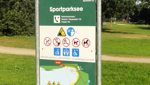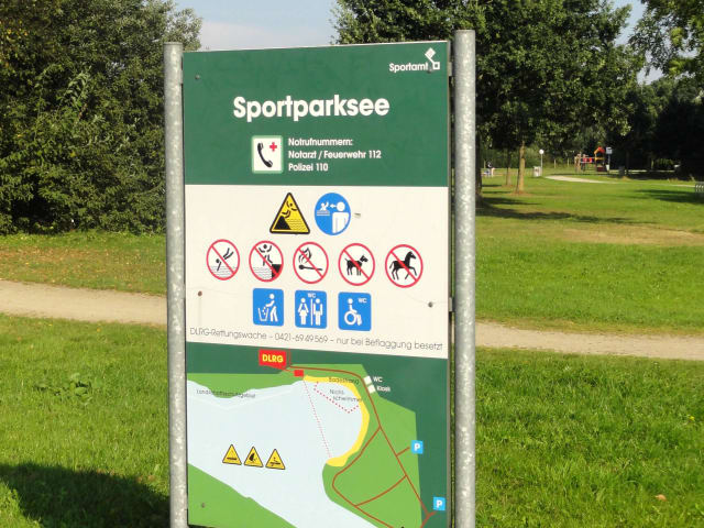 Im Jahr 2002 entstand im Bremer Nordwesten ein großes Industriegebiet und für dessen Untergrund wurde im Stadtteil Grambke Sand auf einer Fläche von etwa 40 Hektar entnommen – die Geburtsstunde des Sportparksees. 3 Jahre später wurde der See als Naherholungsgebiet für die Öffentlichkeit freigegeben und dient seither als größtes Binnengewässer der Hansestadt nicht nur Badegästen, sondern auch Wassersportlern als Revier. Für Segler, Ruderer und Kanuten gibt es eine Regattastrecke, eine Surfschule bietet Kurse und Materialverleih an und auf einer Slipanlage kann jedermann seine Boote bequem zu Wasser lassen. Rund um den See führt ein Spazierweg, große Liegeflächen und ein Kiosk machen den Badetag angenehm und eine Wasserwacht sorgt zudem für die Sicherheit der Badegäste. Einziger Wermutstropfen des Sportparksees ist die Umgebung, die mit Windrädern, Hochspannungsmasten und dem Ausblick auf Industrieanlagen nicht unbedingt dem Auge schmeichelt. Dafür ist die Wasserqualität untadelig und das Areal so riesig, dass auch im Hochsommer mehr als reichlich Platz für alle Besucher vorhanden ist.