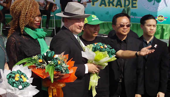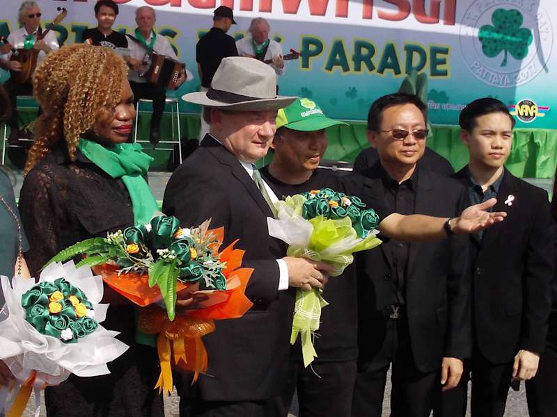 Alljährlich am 17. März dem Nationalfeiertag der Iren war es wieder soweit. Sie haben ihren St. Patrick´s Day mit einer riesigen Parade in der Touristenmetropole gefeiert. Dieses Jahr jedoch nicht so ausgelassen wie die Jahre zuvor, da die Trauer um seine Majestät, König Bhumibol Adulyadej (am 13.10.2016 verstorben) immer noch groß ist. Dieses mal war die Parade von Grün-Schwarz geprägt. Der irländische Botschafter in Bangkok, Brendan Rogers gab sich zur 7. Veranstaltung zum ersten Mal als Repräsentant seines Landes die Ehre. Um 14:00 Uhr begann die Veranstaltung auf dem großen Parkplatz vor dem Alcazar Cabaret in der Second Rd, GPS 12.944264, 100.888910 mit Darbietungen von irischen Liedern und Musik, Vorstellung der teilnehmenden Gruppen und die Aufstellung für die stattfindende Parade. Der Botschafter selbst hisste die irische Fahne. Um 16:00 Uhr ging die Parade mit großem Polizeiaufgebot über die Soi 4 zur Beach Rd (extra Tipp) entlang bis zur Walking Street (extra Tipp) und dann zur Muang Pattaya Schule Nr. 8 (GPS 12.925545, 100.875582), wo die Preisverleihung stattfand. Alle Einnahmen dieser Veranstaltung gehen wie immer an die Father Ray Foundation. Eine sehr schöne Veranstaltung die man sich nicht entgehen lassen sollte. Wir werden uns dieses Treiben jedenfalls nächstes Jahr wieder ansehen.