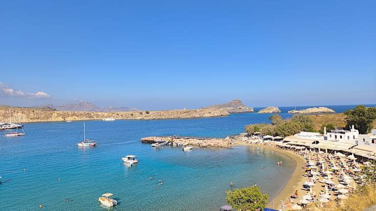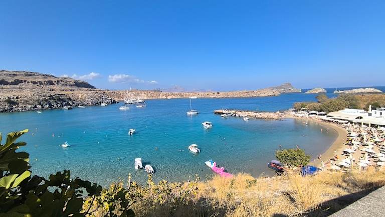Die kleine Bucht wirk von oben (aus Richtung Akropolis) sehr ruhig und idyllisch. In Wirklichkeit ist die Bucht völlig überlaufen. Es gibt von Lindos aus eben nicht viele Badestellen, die zu Fuß erreichbar sind. Einen kurzen Abstecher ist sie aber wert.