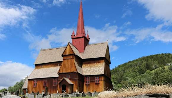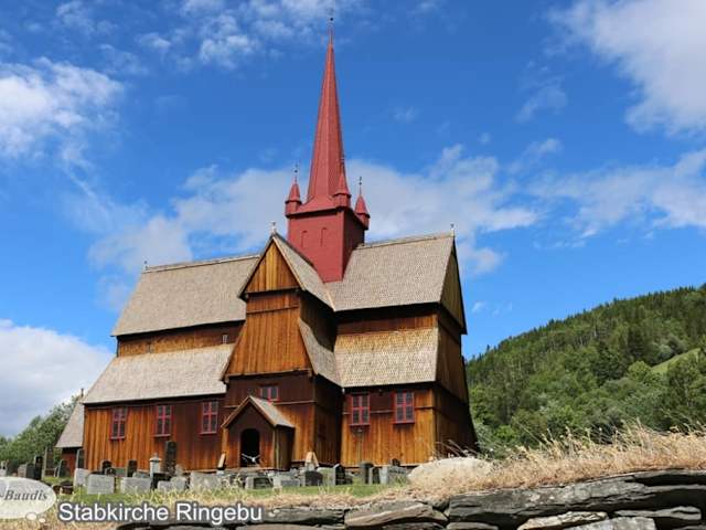 Die hölzernen Stabkirchen (norw.Stavkirker) sind die wohl bekanntesten Zeugnisse mittelalterlicher Baukunst in Norwegen. Kein Nagel oder Eisenteil wurde hier je verwendet. Den norwegischen Stürmen trotzt einzig und allein die Stabbauweise. Ähnlich wie bei den Wikingerschiffen versteift die Anordnung von Rahmenhölzern, Knaggen und Andreaskreuzen den Bau. Der älteste Teil der Stabkirche zu Ringebu, der Westteil, stammt aus dem 13.Jahrhundert und wurde als Stabkirche erbaut. Das Querschiff und der Kirchturm sind das Resultat eines Umbaus um 1630. Das Westportal stammt aus dem Mittelalter und ist im sog. Drachenstil geschnitzt. Einige Daten - Taufstein aus Speckstein 12.Jahrhundert -St.-Laurentius-Statue 1250 -Altar 1686 -Kanzel 1703 -erste Orgel ca. 1800 -jetzige Orgel 1982 Die Kirche ist in den Sommermonaten außer bei Gottesdiensten für Besichtigungszwecke gegen geringes Eintrittsgeld geöffnet.