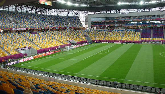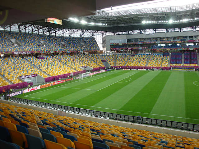 Das neue Schmuckkästchen von Lwiw hat ca. 35.000 Plätze. Für das EM-Spiel Portugal : Dänemark wurden 30.000 Zuschauer von der UEFA zugelassen. Das Stadion war ausverkauft. Die Stimmung herrlich. Alles brandneu. ca. 12 km außerhalb der Innenstadt. Dadurch das keine Laufbahn zwischen dem Spielfeld und den Tribühnen ist, sitzt man sehr nahe am Geschen. Nach der EM wird vermutlich der lokale Verein Karpaty Lwiw hier seine Heimspiele austragen.