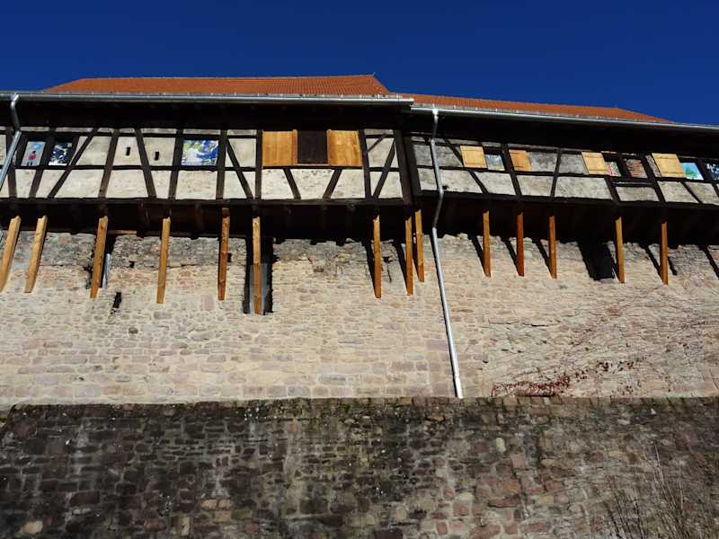 Entlang der Waldbachstraße führt der Weg hinunter zur Murg entlang der alten Stadtmauer. Bereits im 13. Jahrhundert wurde eine Stadtmauer mit Zwinger, Toren und Türmen urkundlich erwähnt. In den 1990ern wurde die Straße ausgebaut und dabei ein Teil der Bebauung entfernt - seitdem kann man die Stadtmauer wieder erkennen. Im unteren Bereich auf die Stadtmauer aufgesetzt sieht man die Zehntscheuer aus dem 18. Jahrhundert. Sehr schön auch zum gemütlich Spazieren - zwischen Straße und Mauer verläuft ein kleiner Bach.