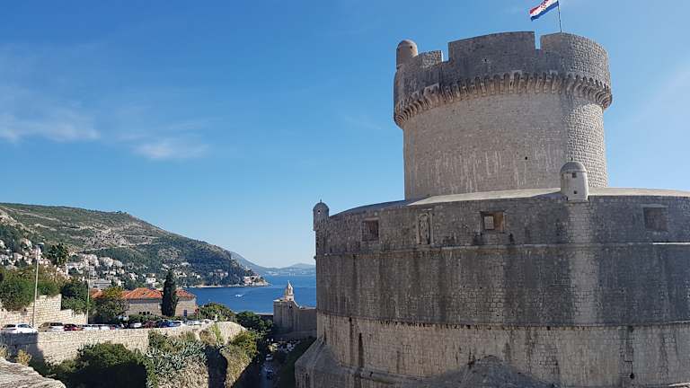 Der Eingang zur Stadtmauer von Dubrovnik ist gleich links hinter den Stadttor zu finden. Der Eintritt beträgt 70 Kuna (10 Euro) und kann nicht in Euro gezahlt werden, aber mit EC-Karte oder Kreditkarte kann bezahlt werden. Über eine steile Treppe erklimmt man dann die Stadtmauer, für Rollstuhl ungeeignet. Der Rundgang auf der Stadtmauer sind ungefähr 2 Kilometer und ist wohl die größte touristischen Attraktion von Dubrovnik. Im wieder hat man fantastische Aussichten auf das blaue Meer und die malerischen roten Dächer von Dubrovnik. Eine kleine gemütlichen Bar lädt zur Pause und einem frisch zubereiteten Obstsaft ein. Zu unserer Reisezeit im November waren nur wenige Besucher unterwegs und wir konnten alles in Ruhe genießen. In der Hauptreisezeit im Sommer kann es aber sehr voll werden.