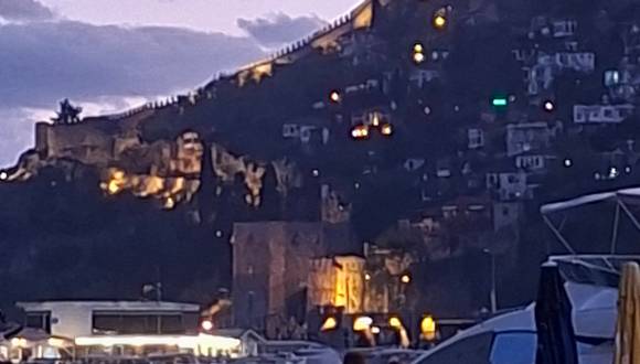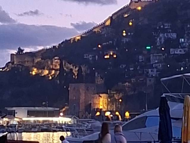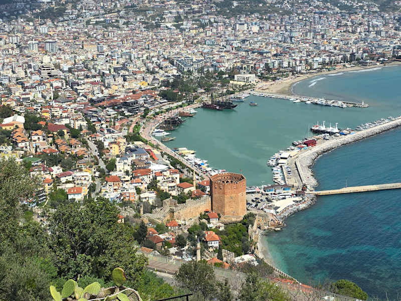 Die Stadt Alanya zu beschreiben ist wahrscheinlich sehr,sehr aufwändig. Denn einer Erzählung nach, daß hier in Alanya und Umgebung ca. 20 000 deutsche Bürger wohnen, natürlich im eigenen Haus oder Wohnung, war für uns erstaunlich. Da bieten sich auf die Schnelle die wichtigsten Sehenswürdigkeiten an. Das ist die Fahrt mit der "Teleferik" also dem Gondellift auf den Berg in 300 m Höhe an. Solch eine Fahrt im "Marco Polo" Reiseführer wurde dort mit 12.-€ angegeben, aber das ist eine Täuschung gewesen, die Wirklichkeit ist anders. Aktuell verlangt man je Person 24.- Euro. Mit dem Wechselkurs hat uns unsere Bank den Betrag von 21.-Euro je Person abgebucht. Mit solchen Erhöhungen wurde bei den deutschen Veranstaltern wie "Alltours" und auch weitere, solche Ausflugsziele gestrichen. Macht ja nicht soviel aus, wir fuhren trotzdem hinauf. Da gibt es den schönen Hafen mit dem Roten Turm, auch die in der Nähe liegende "Alte Werft" ist sehenswert. Auch wollten wir den Kleopatrastrand sehen, wer das alles erleben möchte braucht einfach ein Taxi, denn der Fahrer kennt sich aus, wenn er Deutschsprachig ist. Zum Glück er war es.