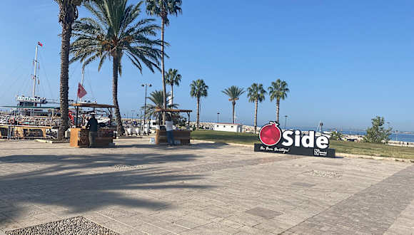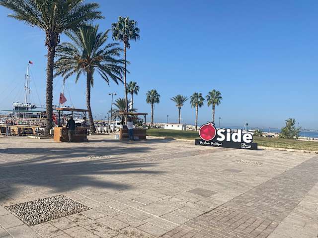 Vom Hotel Nerton läuft man die Strandpromenade entlang bis zum Hafen von Side - Altstadt ca. 35-40 Minuten. 300 m vom Hotel ist die Post. Zu den Mini Bussen, muss man einen Berg hochlaufen, bis zur Hauptstraße.