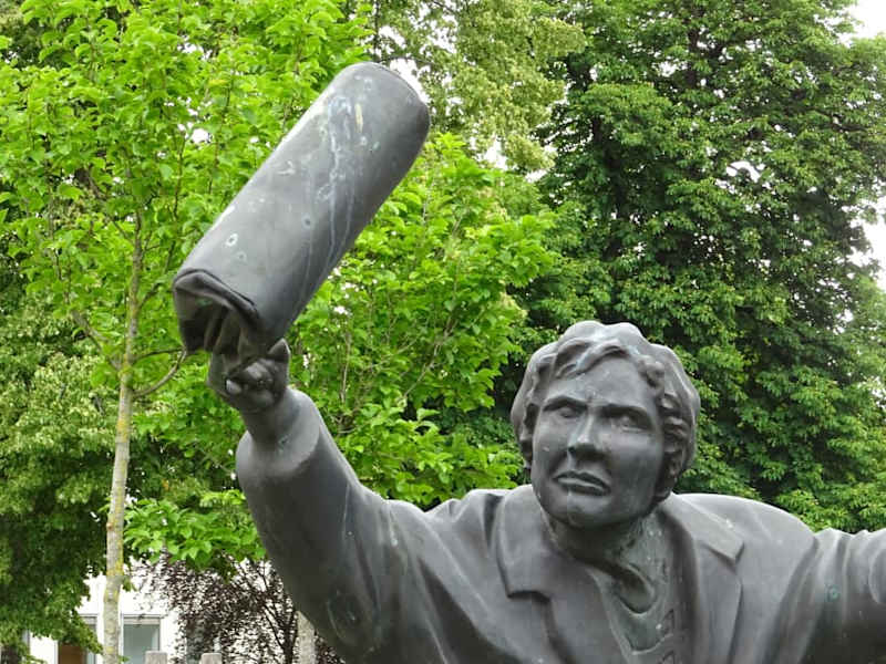 Die Statue einer Frau, die mit ihrer Handtasche zum Schlag ausholt, steht im Park vor dem Grand Hotel in Alingsas. Sie stellt eine Szene dar, die sich in den 1980ern ereignet hat - eine ältere Frau hat einen Neo-Nazi mit ihrer Handtasche geschlagen.