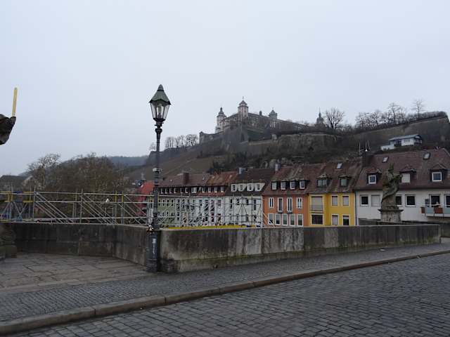Auf der Alten Mainbrücke wurden im 18. Jahrhundert 12 Heiligenfiguren aufgestellt. Die Statue des St. Bruno steht dekorativ - im Hintergrund auf der Anhöhe findet man die Marienfestung.