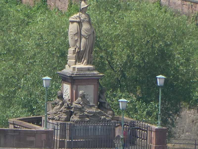 Bei einem Bummel über die Alte Brücke / Karl-Theodor-Brücke kommt man auch an zwei übergroßen Statuen vorbei. Vom Brückentor aus gesehen, befindet sich gleich links der Kurfürst Karl Theodor und später, ebenfalls links, die römische Göttin Minerva (manchmal auch als griechische Göttin Pallas Athene bezeichnet). Diese beiden Brückenfiguren machen die Brücke erst komplett.