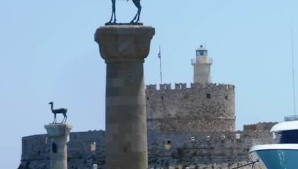 Direkt zur Hafeneinfahrt befinden sich auf hohen Sockeln stehend zwei Bronzestatuen. Und zwar vorne links die Staue Elfos und hinten rechts die Statue Elafina. Sie zeigen einen Hirsch und eine Hirschkuh. Seit der italienischen Besetzung 1972 bis 1947 bewachen diese beiden die Hafeneinfahrt. Der springende Hirsch ist das Wappenzeichen der Insel Rhodos. Eine Legende besagte das eine Ansiedlung von Hirschen eine Schlangenplage von Rhodos fern halten sollte. Einer weiteren Legende zu Folge sollte an der Stelle , wo sich jetzt die beiden Hirsche befinden, der Koloss von Rhodos gestanden haben ---eines der sieben Weltwunder. Es soll eine 34 Meter hohe Bronzestaue gewesen sein und den Gott Helios dargestellt haben.Der aber schon 227 vor Christus von einem Erdbeben zerstört wurde. Allerdings ist man sich nicht so wirklich sicher,ob er wirklich in der Hafeneinfahrt oder an einem anderen Ort gestanden hat. Es ist eine Sage und nicht wirklich bewiesen.