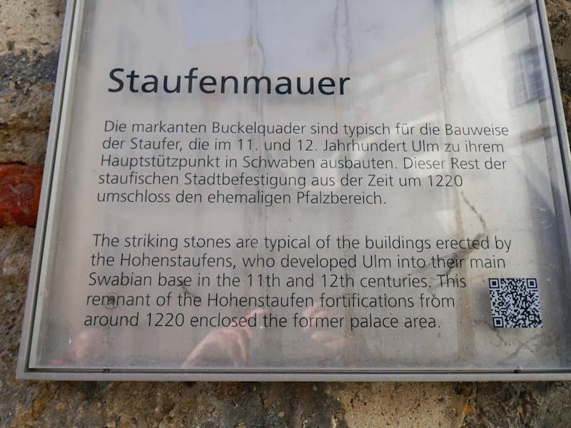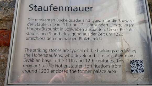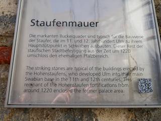 Die Staufer haben bei dem Stadtmauerbau im 11. und 12. Jahrhundert, die dortigen Quadersteine bevorzugt. Heute kann man noch einen kleinen Teil der Mauer sehen, die den staufigen Pfalzbereich umschloss. Ulm war ein wichtiger "Pfalzbereich" vom Otto I. nach seinem Sieg um 955 über die Ungarn. Das Pfalzgebäude war wahrscheinlich auf dem Weinhof, was Wissenschaftler vermuten. 1174 wurde zum erstenmal die Donaubrücke erwähnt, ab dem Jahr 1184 wurde Ulm zur Reichsstadt erhoben.