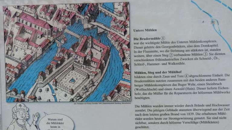 Am Fluss Regnitz in Bamberg waren früher insgesamt acht Mühlen in Betrieb. Heute wird nur noch die ehemalige Schneidmühle zur Stromherstellung an der unteren Mühlbrücke genutzt. Eine weitere Mühle an der Unteren Mühlbrücke ist die Vogtmühle. Die oberen Steinmühlen werden heute noch als Hotel, Wasserkraftwerk und Studentenwohnheim genutzt. Zu den schönsten Vierteln Bambergs gehört unbedingt das Obere Mühlviertel. Ein Spaziergang inmitten der seit dem 10. Jh bestehenden Gassen entlang der Regnitz kann ich sehr empfehlen.