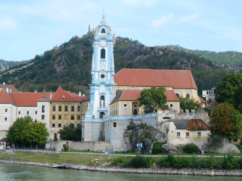 Die zur Donau ausgerichtete Fassade der ehemaligen Stiftskirche wird von dem blau-weißen Turm im Stil des Hochbarock dominiert, der als „Fingerzeig Gottes“ zu einem Wahrzeichen der Wachau geworden ist. Die Augustiner-Chorherren, die zu Beginn des 15. Jahrhunderts aus Böhmen nach Dürnstein kamen, errichteten das Kloster und die Kirche, wo bereits vorher eine Marienkapelle bestand. Im 18. Jahrhundert erfolgte der barocke Umbau mit der prächtigen Ausstattung der Kirche, die man heute noch bewundern kann.