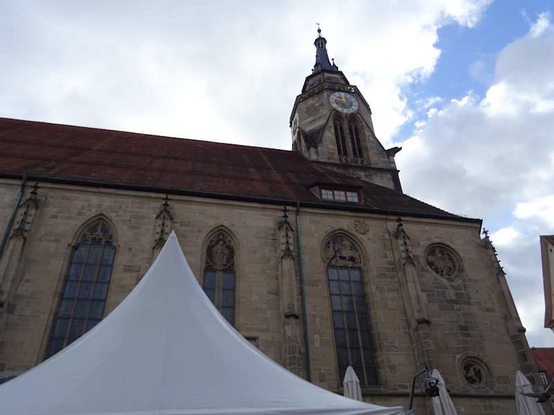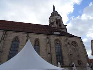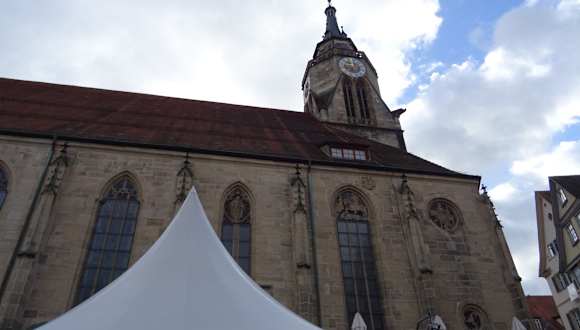 Die Stiftskirche und ihr Turm sind ein Wahrzeichen von Tübingen. Herrlich gelegen zwischen Österberg und Spitzberg hat man einen weiten Blick auf die Schwäbische Alb und das Neckartal. Den Turm kann man besteigen. Ca. 170 Stufen führen hinauf, Eintritt 1,00 €. Die Kirche wurde erstmals 1191 schriftlich als Pfarrkirche erwähnt. Der Bau der spätgotischen Kirche begann am 28. März 1470. Die Turmseite wurde 1483 begonnen.