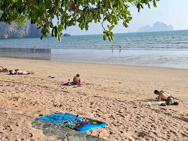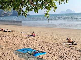 An dieser Stelle möchte ich hier mal ganz deutlich eine riesige Lanze für den Strand von Ao Nang brechen !!!! Nachdem ich vor unserer Reise immer wieder gelesen habe, dass der Strand in Ao Nang schrecklich und nicht zu empfehlen ist, habe ich mich schon darauf eingestellt immer mit dem Longtailbooten zu anderen Stränden fahren zu müssen. Dort aber angekommen, fand ich einen langen, breiten, feinsandigen Strand vor, der außer Sonne auch Schatten durch die dort wachsenden Bäume bietet. OK : Es gibt keinerlei Liegen....... doch was solls ????? Da kauft man sich für ein paar Baht eine Matte und/oder Luftmatratze und liegt ebenfalls bequem. Ganz davon abgesehen, dass man auf den anderen Stränden, die als ganz besonders toll empfohlen werden, meist auch keine Liegen findet da es alles naturgeschützte Strände sind !!!! Wen störts ? Dafür hat man aber halt auch nicht den Vergleich der Sardinen in der Blechbüchse !!! Der Strand von Ao Nang ist toll! Klar, es gibt immer Strände, die sind weißer !!!!! Wir waren auch nicht zu bequem um ein paar Schritte weiter zu laufen !!! Läuft man nämlich bis zum Ende des Strandes, liegt man fast allein dort. Man kann seine Klamotten einfach dort liegen lassen und gemütlich im "Last Cafe" eine Suppe oder ein Lassi zu sich nehmen. Und anschließend zurückschlurfen. Dort stören einen die Longtailboote auch in keinster Weise !!! Als ich dort auf meiner Luftmatratze im Wasser lag, habe ich nicht nur das Meer rauschen sondern auch die Grillen auf dem Berg, die Affen am Strand und die Vögel im Wald gehört....... es war einfach herrlich !!!! Ich kann den Strand von Ao Nang ganz dringend jedem empfehlen, der sich nicht zu schade ist fünf Schritte weiter zu laufen als die meisten Urlauber. Direkt vor dem letzten Cafe habe ich mein Paradies mit traumhaftem Ausblick gefunden !!!!