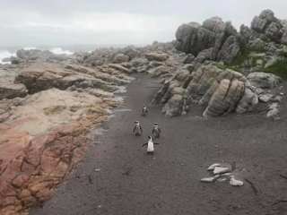 Die Pinguine am Betty's Bay in Südafrika kann man auch bei Regen und Wind im April sehr gut beobachten. Der Vorteil war, dass wir während des Regens fast die einzigen auf dem Steg waren. Die jüngeren Pinguine (zumindest sahen sie aus wie Jungendliche) watschelten munter umher während die Eltern sich kuschelnd um ihre Eier oder Jungen drängten. Als später der Regen nach ließ und die Sonne heraus kam liefen sie auch außerhalb der Zäune rum. Daher sollte man erst unterm Auto nachsehen bevor man vom Parkplatz fährt, auch dann noch sollte man sehr vorsichtig fahren. Auf der Straße zum Pinguinstrand kann man auch Baboons (Paviane) entdecken.