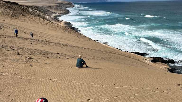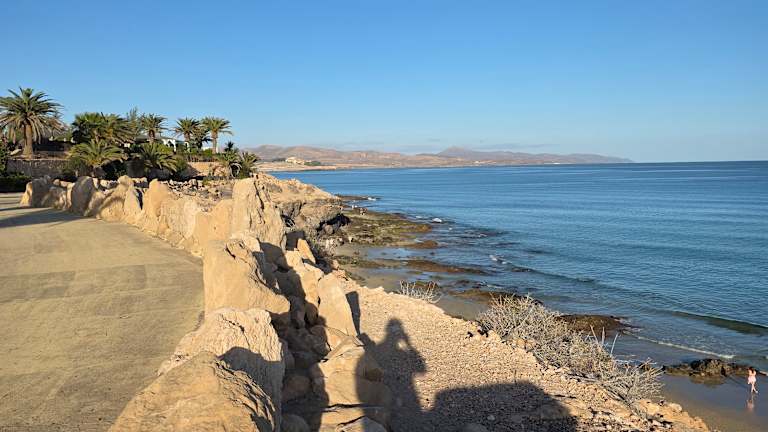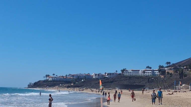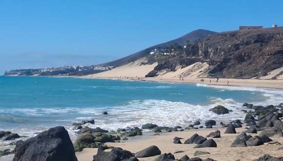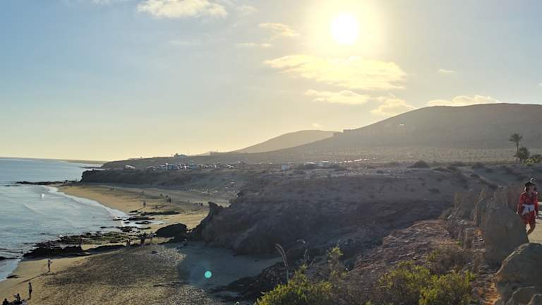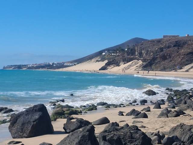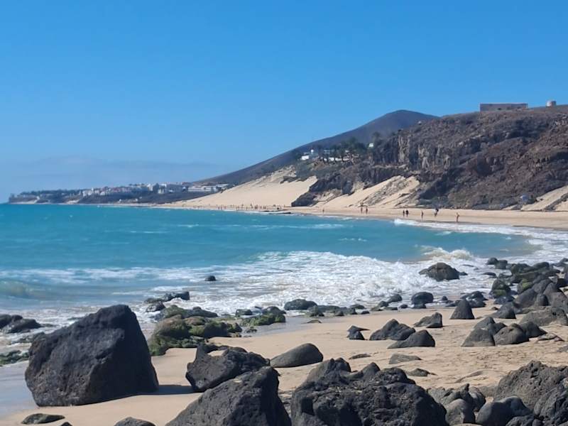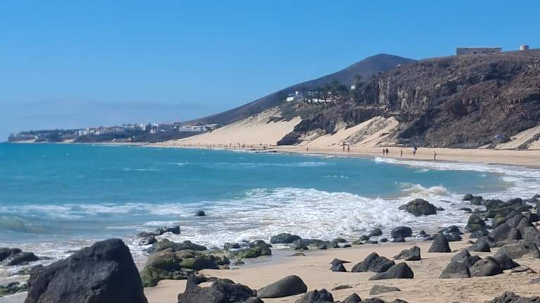Der zentrale Strand von Costa Calma liegt in einer sanft geschwungenen Bucht, die sich in Höhe des Hotels Taro Beach im Norden bis zur Calle Punta Junquillo im Süden erstreckt. Auf gut 1,3 Kilometern Länge findet man hier einen goldgelben, feinen Sand auf einer Breite von annährend 100 Metern, wobei sich das Hinterland des Strandes zum Teil durch Lagunen und Vegetation sehr natürlich zum Ort absetzt. Selbst in der Hauptsaison ist immer reichlich Platz für alle Gäste vorhanden, mehrere Verleihstationen bieten Liegestühle und Sonnenschirme gegen Gebühr an, 2 Strandbuden sorgen für Snacks und kühle Getränke und an einer Surfschule in Höhe des Hotels „Costa Calma Palace“ kann man sich Board und Equipment ausleihen. Der Strand von Costa Calma ist ein echter „Familienstrand“, der sich insbesondere auch für kleinere Kinder prima anbietet: Das Meer zeigt sich meistens von seiner freundlichen Seite mit einer sanft auslaufenden Dünung, die sich aufgrund des nur flach abfallenden Meeresbodens kaum bricht. Für Schnorchler leider total unspektakulär, aber für Badende eine echte Freude: Auch unter Wasser finden sich keine Überraschungen – steinfreier Sandboden soweit das Auge reicht, so dass man getrost auf Badeschuhe verzichten kann. Im Süden der Playa Costa Calma geht der Strand in eine Reihe von Buchten über, die durch Vulkanfelsen in kleine Strandabschnitte separiert werden, in denen sich besonders die Anhänger eines textilfreien Badetages wohl fühlen. Folgt man der Küstenlinie dann weiter gen Süden, erreicht man die Playa Barca und danach die unendlichen Weiten des Strandes von Sotavento de Jandía, der zu den Highlights der Insel gehört.