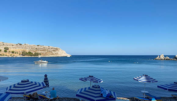 Schöner, wenn man möchte, einsamer Strand. Nur am Anfang, direkt unterhalb des kleinen Parkplatzes stehen etwa 20 Schirme mit je 2 Liegen zu 8€/Tag. Danach in Richtung Lindos ist schätzungsweise 2 km Kiesstrand absolu frei und verlassen. Wie an einsamen Stränden in Griechenland üblich, kann aber etwasWohlstansmüll rumliegen.