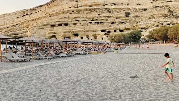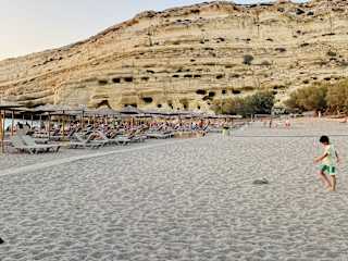 Schöner ruhiger Strand aber viele Touristen wegen der Höhlen von Matala. Der Ort ist touristisch geprägt. Tavernen und Cafe's direkt am Strand sind nicht überteuert.