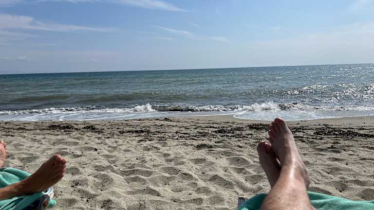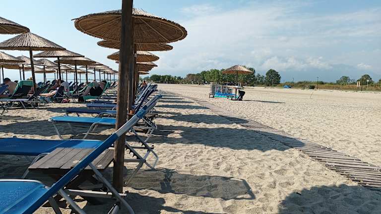 Der Strand in Paralía selbst war in der Zeit meines Aufenthaltes (Ende April / Anfang Mai) an manchen Tagen schon recht gut besucht. War halt schönes Wetter. :-) Ging man aber über die Ortsgrenzen hinaus, so fand man sehr (!) breite und völlig leere Strände in beiden Richtungen. Dort hatten zwar die ersten „Paralía-Hotels“ (ihre Anzahl hält sich außerhalb des Ortes wirklich in Grenzen) bereits Schirme und Liegen aufgestellt, allerdings wurden sie von nur sehr wenigen Gästen genutzt. Mir gefiel dieser gefühlt unendliche Strand - zum Rand der spärlich befahrenen Küstenstraße hin naturbelassen und sich Kilometer um Kilometer hinziehend. So liegen zwischen den Ortseingängen von Paralía und Olympiaki Akti / Olympic Beach rund 4 km, auf denen ich übrigens nur fünf Hotels gezählt habe. Man kann’s prima zu Fuß ablaufen. Bänke zum Ausruhen gibt es in regelmäßigen Abständen. Oder man mietet sich ein Fahrrad. Sehr schön auch der Blick zur Landseite hin: Man schaut über Wiesen auf die oben noch mit Schnee bedeckten Berge, den Olymp. Und der Schnee soll dort bis Ende Juni / Anfang Juli zu sehen sein. (Diese Angabe ist allerdings ohne Gewähr. :-)