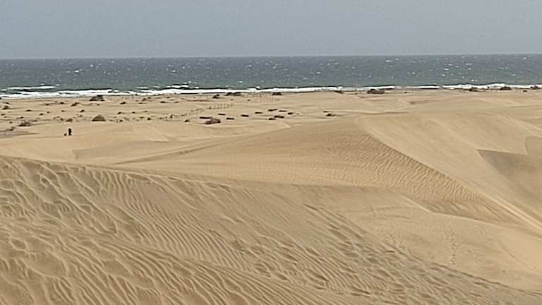 Der 2,7 km lange Strand von Playa del Ingles ist einer der berühmtesten Strände von Europa. Aufgrund des milden Klimas von Gran Canaria ist die Insel das ganze Jahr sehr beliebt und zählt zu einen der meistbesuchten Reiseziele in ganz Spanien. Wir fuhren mit dem Shuttle-Bus von unserem Hotel in San Agustin nach Playa del Ingles. Von der Bushaltestelle zum Strand von Playa del Ingles war es nicht mehr sehr weit. Wir spazierten entlang der schönen Fußgängerpromenade Paseo Costa Canaria, die von einer tropischen Flora und luxuriösen Ferienhäusern gesäumt ist. Von der Promenade aus, hatte man einen herrlichen Ausblick auf den weitläufigen Strand. Der kilometerlange Sandstrand von Playa del Inglés ist über Treppen bzw. Lift erreichbar. Als nächstes suchten wir uns einen Strandplatz. Trotz Nachsaison waren viele Plätze bereits belegt. Wir legten uns dann auf 2 freie Liegen unter einen Sonnenschirm. Nach einer Weile kam der zuständige Platzwart zum kassieren. Wir bezahlten für 2 Liegen und einen Sonnenschirm 7,50 Euro. Das Problem für uns waren die engen Abstände zum Nachbarn, man lag so zusammengedrängt, wie die Fische in einer Sardinenbüchse. Wie schaut es da erst in der Hochsaison aus? Wer keine Angst vom Sonnenbrand hat und sich Kosten sparen will, kann sich natürlich auch mit einem Badetuch in den Sand legen. Die bessere Alternative wäre, sich einen Sonnenschirm für den Badeaufenthalt in Gran Canaria zu kaufen. Auf jeden Fall muss man beachten, dass man bei roter Flagge nicht ins Wasser gehen darf. Was sich bei einigen Gästen anscheinend noch nicht herumgesprochen hat. Wer Lust und Kondition hat, kann entlang des Strandes von Playa del Ingles zum Leuchtturm von Maspalomes und zurück gehen. Besonders interessant fanden wir einen Spaziergang in den Dünen von Playa del Ingles. Wir gingen durch die Dünenlandschaft bis zum Hotel Riu Palace am Rande der Dünen. Vom Hotel aus, hatte man einen wunderbaren Blick über die Sanddünen zum Meer. Da es in der Nähe der Dünen auch einen FKK-Bereich gibt, begegnet man sehr viele FKK-Anhänger beim Wandern in der Dünenlandschaft. An der Strandpromenade von Playa del Ingles befindet sich auch der bekannte Shoppingcenter Anexo 2. Das Anexo zieht sich über einige hundert Meter direkt am Strand entlang. Rechts und links befinden sich viele Geschäfte, Restaurants, Bars und Pubs mit Blick auf das Meer und den Strand. Das Anexo 2 hat von morgens bis in die späten Abend- und Nachtstunden geöffnet. Wer Trubel mag, ist in Playa del Ingles bestens aufgehoben. Wer jedoch Ruhe und Entspannung sucht, der sollte sich lieber einen anderen Ort auf Gran Canaria suchen.