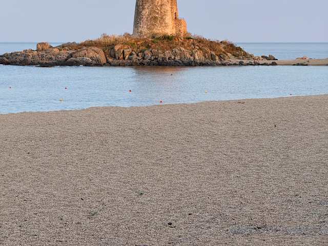 Sehr schöner Strand mit feinkörnigen Kieselsteinen, rötlich ! Wenn man barfuß Richtung Meer geht, peeling pur ! Wenn man früh kommt ergattert man ein Stellplatz im Schatten. Klares Wasser und ein schicker Turm als Fotomotiv.