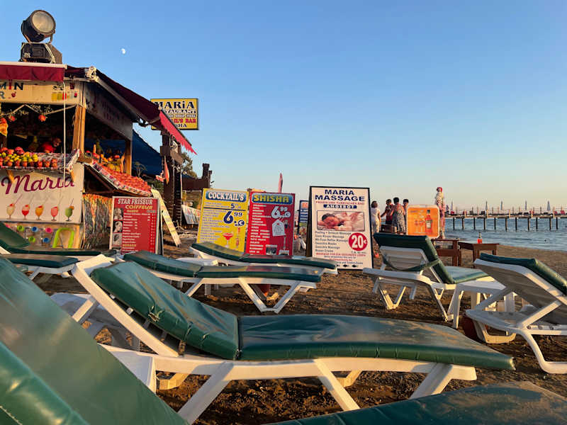 Bei Ismet ist es wunderschön, man sitzt Abends direkt am Strand, zwei Meter neben den Wellen. Gute Musik und zwei mal in der Woche macht er sogar eine Schaumparty. Befindet sich neben dem Hotel Thalia Beach.