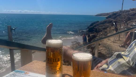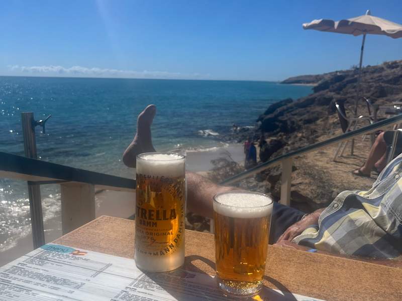 Sehr nett einfache Strandbar am kilometerlangen, breiten Strand. Grosses Bier 2, 30 Euro und Shripms in Knoblauchöl 9,- Euro