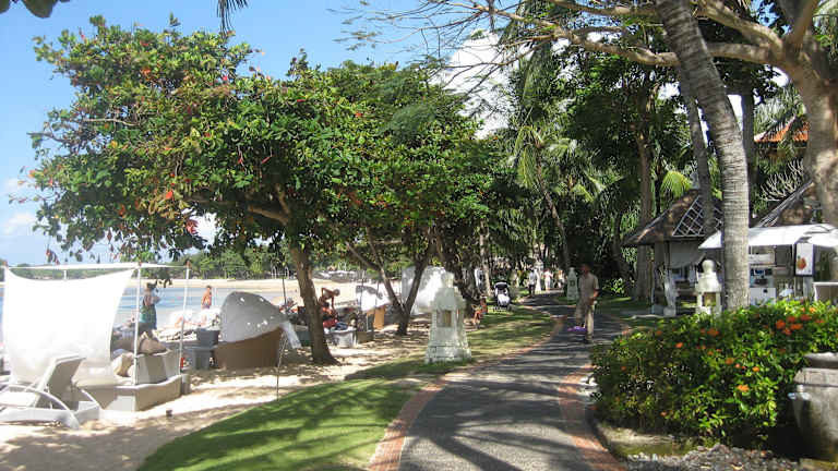 Entlang des gesamten Strandanschnittes Tanjung Benoa und Nusa Dua befindet sich eine gepflasterte Strandpromenade.Unser Hotel ( Melia Benoa) war das letzte im Abschnitt Tanjung ,so konnten wir in beide Richtungen diese Promenade in gut 30-40 Min. entlang laufen je nach dem wie schnell man gelaufen ist.Die gesamte Promenade ist gepflastert.Zwar nicht sehr breit,aber doch so breit,dass man gut laufen kann.Auf der einen Seite Strand und Meer und auf der anderen Seite Hotels,Restaurants,Shops,Verkaufstände,Cafes und „ Fliegende Händler“.Es ist schön dort entlang zu laufen,mal in der Sonne,mal im Schatten.Sehr vielseitig,weil es alles bietet.Wer keine Ruhe hat um ewig auf der Liege zu schmorren,sollte diese Sparziergänge auf alle Fälle nutzen.