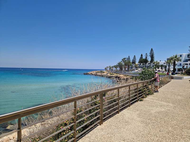 Möchten Sie in Pafos auf Zypern bei einem wunderschönen Spaziergang gleich die vielen schönen Strandhotels kennen lernen? Dann starten Sie ihren Bummel am öffentlichen Strand, am Ende des Hafens beim Hotel Annabelle auf dem Strandweg Richtung stadtauswärts. Kurz nach dem Hotel Annabelle kommt man am Hotel Alexander the Great vorbei, das besonders bei britischen Touristen beliebt ist. Weiter geht es - der Blick geht hinaus aufs Meer - unter Palmen längs. Immer wieder schauten wir hinaus aufs Meer und oben im blauen Himmel setzen die Flugzeuge an zum Landeanflug zum Pafos Airport. Nicht so sehr störend, denn die Jets sind noch recht abseits über dem Meer. – Andererseits haben wir ja auch davon profitiert bei der Anreise und relativ kurzem Transfer zum Hotel. Weiter ging es vorbei an Constantinou Brother Hotels, dem Athena Royal Beach, Athena Beach Hotel, Asimina Suite Hotel (ich weiss nur nicht mehr in welcher Reihenfolge sie hier an der Meerespromenade liegen.) Die Promenade endet dann an einem „Sunset Point“ am Meeresufer, als Fotopunkt so bezeichnet: Von hier aus kann man bei geeigneter Witterung den Sonnenuntergang beobachten oder fotografieren. Aber das Schönere war und ist das kleine Kirchlein, das dort am Ende des Weges steht – es lädt ein zur Besichtigung, zur Rast und zum Gebet. Es ist in strahlendem Weiss ganz neu hier erbaut und drinnen sehr schön bemalt mit Bildern von orthodoxen Kirchenfürsten und sakralen Themen. Unser Tipp: Gleichgültig, wo Sie Ihren Spaziergang beginnen – dort vom Kirchlein aus (dahin kommt man aus Pafos mit dem Bus, der nach den Hotels dort an dem Parkplatz hält, bevor er zum Waterpark weiterfährt) oder man läuft die Promenade vom Pafos Hafen aus – oder man könnte auch dort entlang radeln. Auf jeden Fall ist es ein wunderschöner Spaziergang.